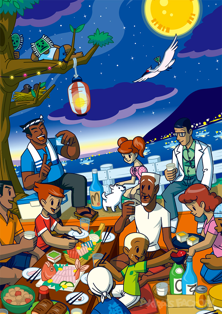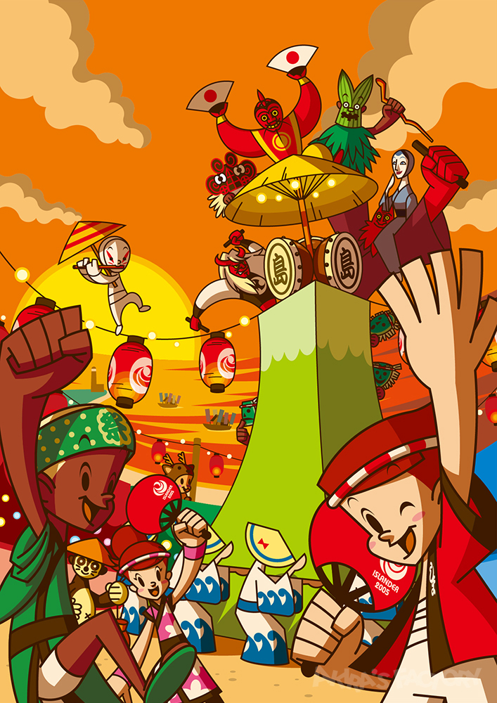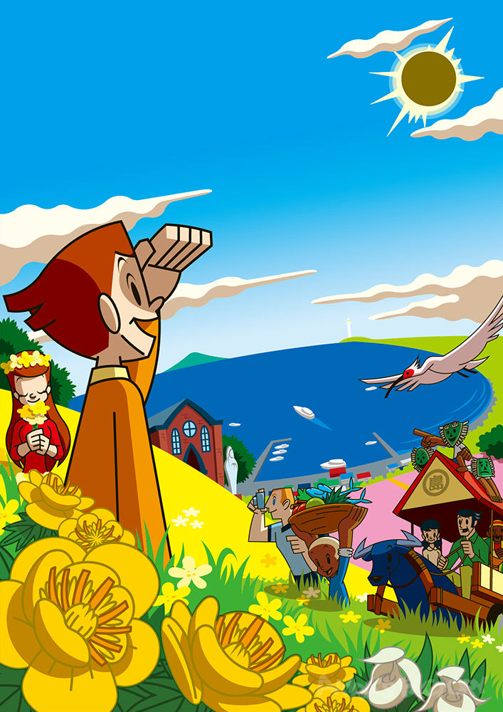 今回は島の祭りがテーマ。島のさまざまな神様が登場し、お祭りの様式が混在した賑やかな一面となりました。島のゆるキャラ「ちかまるくん」がいます。