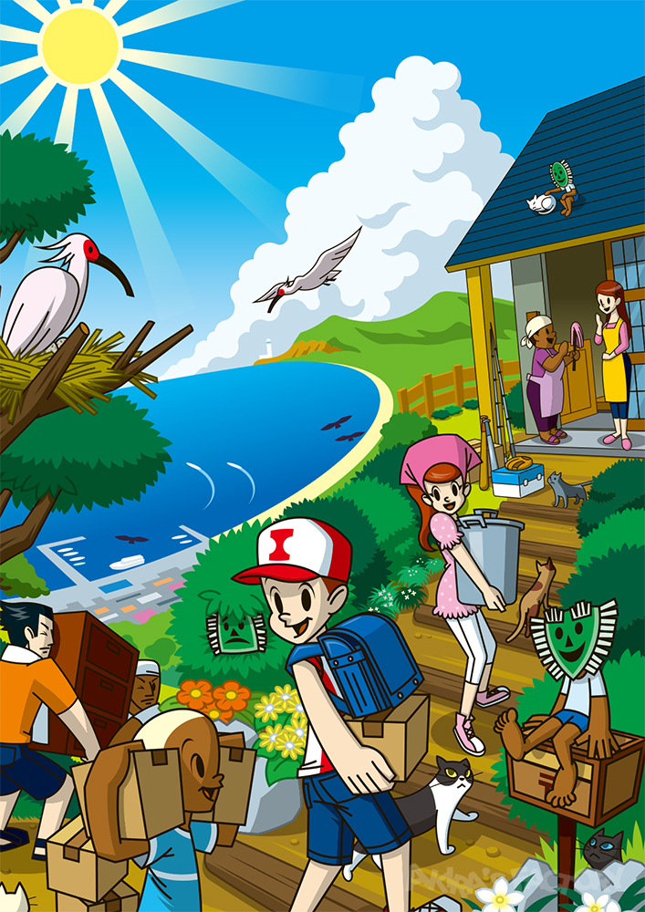 島への移住を決めた都会の子一家が引っ越し先の住居に荷物を運んでいるイメージです。島の人たちも引っ越しをお手伝い。猫がいっぱいいる島のようです。