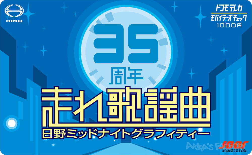 走れ歌謡曲35周年記念 2026.01.172026.01.22 文化放送「走れ歌謡曲」放送35周年を記念した、特製テレホンカードのビジュアルを担当しました。夜の街並みの先に浮かぶ月に「35周年」を象徴的に配置、番組ロゴの黄色が際立つようブルー系でまとめました。 【クライアント】文化放送/日野自動車【制作年】2002年【使用ソフト】Adobe Illustrator